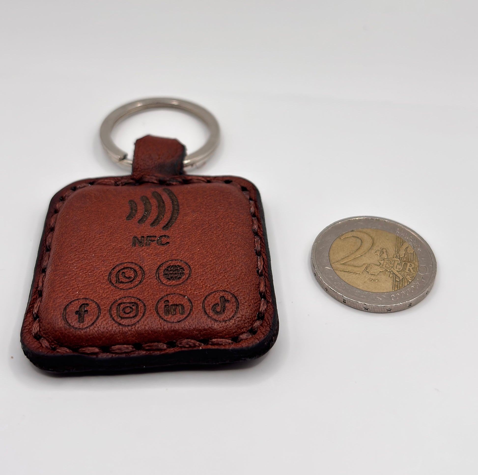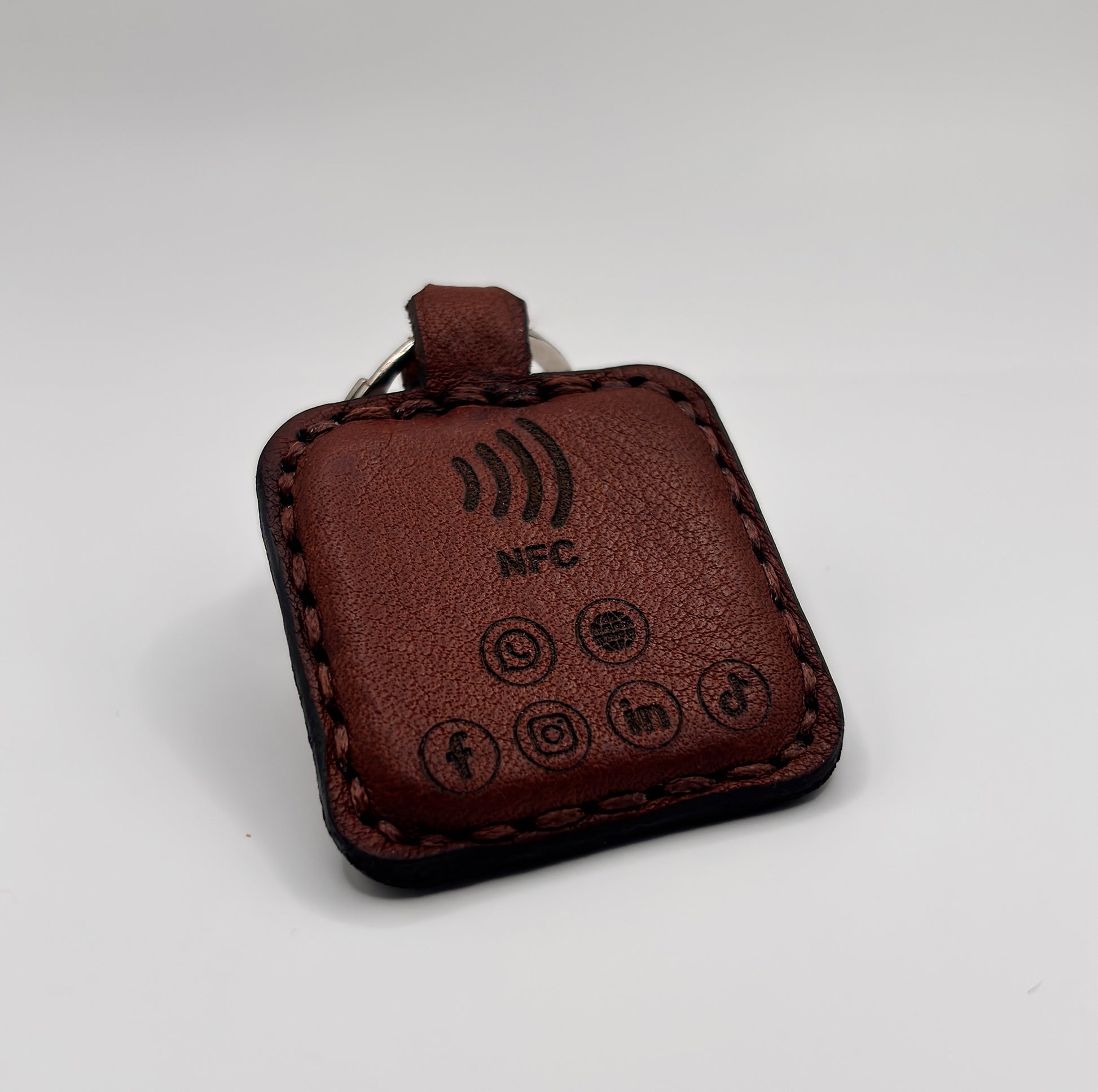 Mit diesem hochwertigen NFC-Schlüsselanhänger in elegantem Braun bringst du deine Visitenkarte in die Zukunft – kontaktlos, digital und stilvoll. Der viereckige Anhänger aus echtem Nappaleder vereint klassisches Design mit innovativer Technologie.